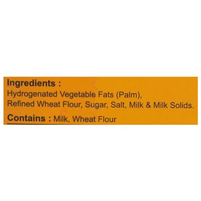 Hydrogenated Vegetable Fats (Palm), Refined Wheat Flour, Sugar, Salt, Milk & Milk Solids.