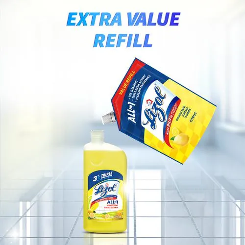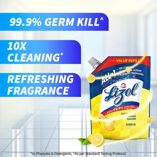 Lizol is India’s No.1 Floor Cleaner, highly recommended by the Indian Medical Association. Lizol Surface Cleaner guarantees to kill 99.9% bacteria#, fungi^ & viruses^ (including Covid-19 virus) while leaving your workplace smelling fresh with a refreshing citrus fragrance. Lizol Disinfectant Cleaner also cleans tough stains when used undiluted. It is available in other variants like Floral, Lavender in the sizes: 500 ml, 975 ml, 1L, 2L and 5L.
