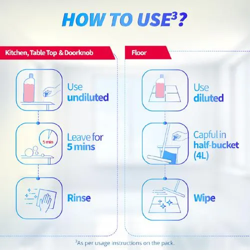 - Kitchen Surfaces: For tough stains use undiluted. Apply on a dirty surface. Leave for 5 minutes and then rinse well with water immediately.
