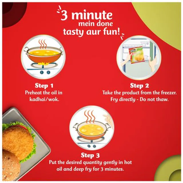 The patties need to be when they are not in use. You can defrost the number of patties you need in the microwave, or even fry, or bake. You can then place the patty between two slices of burger bread, layer with sliced tomatoes and onions, add a dollop of mayonnaise and cheese and take a big, delicious bite!
