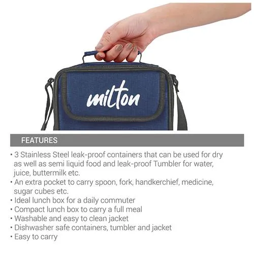Milton New Steel Combi Lunch Box is 3 Stainless Steel containers made of high-quality plastic. It is durable and long-lasting as it is made of stainless steel. The double-layer steel has better insulation. It is made with anti-bacterial, non-porous material. It has air-tight, leak-proof containers. The containers have a bag so that they can be easily carried and are completely leakproof. This lunch box also contains a tumbler to carry drinking water or any beverage.