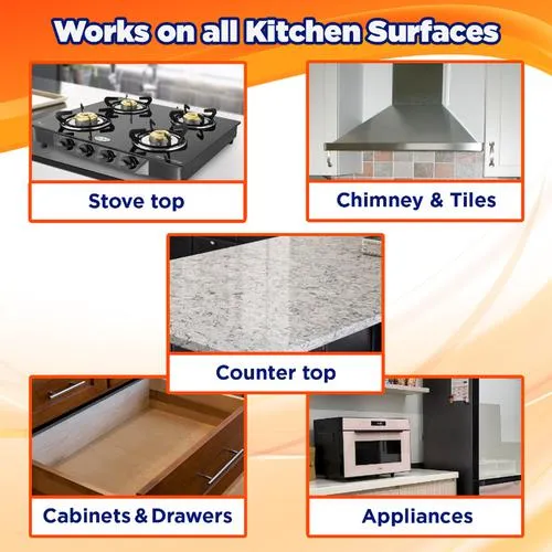 Removes 100% of Kitchen Grease* Cleans all types of kitchen stains, including stains from grease/oil, turmeric, curry, masala, tea, coffee, rice, water, ketchup, etc. Works on all kitchen surfaces (stove, chimney, exhaust, countertop, tiles, microwave, etc.) Provides 10 times better cleaning vs. dishwash bar and liquid soap. Kills 99% of the germs. Refreshing lemon fragrance
