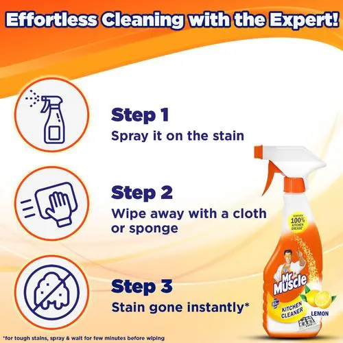 Kitchen cleaning will never be a hassle ever again, thanks to Mr. Muscle Kitchen Cleaner! This kitchen cleaning expert is perfect for removing all kinds of kitchen stains on all types of surfaces effortlessly. It is 10 times better* than dishwash bar and liquid soap, making kitchen cleaning convenient and time-saving. This kitchen cleaner works on the toughest of stains, such as oil stains, grease, burnt milk, turmeric, curry, masala, dried milk, tea, coffee, rice, water stains, and many more. Mr. Muscle Kitchen Cleaner spray removes 100% of kitchen grease* from surfaces, including the stove, chimney, exhaust, countertops, tiles, refrigerator, and microwave. Its unique trigger design prevents spillage and wastage, saving you time and effort. The kitchen cleaner for grease removal also kills up to 99.9% of germs^, making your kitchen not just shiny clean but also germ-free! *as per standard testing protocol; ^when used undiluted