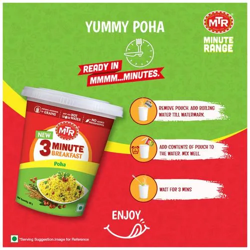MTR Poha is a wholesome & tasty breakfast, ready in 3 minutes with just hot water. Easy to prepare, enjoy this delicious poha every morning with your family and friends.