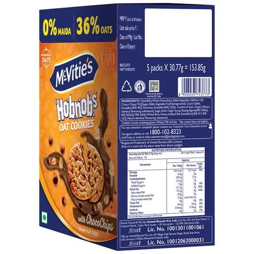 McVitie’s Hobnobs Oat Cookies With Chocochips is a tasty and healthy snack option for you. Enjoy the goodness of crunchy oats cookies with the amazing taste of choco chips in them. These lip-smacking cookies are free from maida, making them tasty and healthy. Replace your regular unhealthy cookies with McVitie’s Hobnobs Oat Cookies With Chocochips. Get it for your kids to spread joy. Explore an entire range of McVitie’s