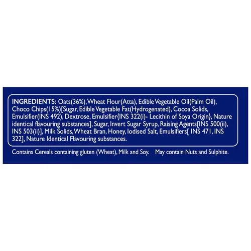 Oats(36%), Wheat Flour(Atta), Edible Vegetable Oil(Palm Oil), Choco Chips(15%), [Sugar, Edible Vegetable Fat (Hydrogenated), Cocoa Solids, Emulsifiers(INS 492), Dexreose, Emulsifier {INS 322 (I)- Lecithin Of Soya Origin ), Nature Identical Flavouring Substance], Sugar Invert Sugar Syrup, Raisin Agent [INS 471, INS 322], Nature Identical Flavouring Substances.