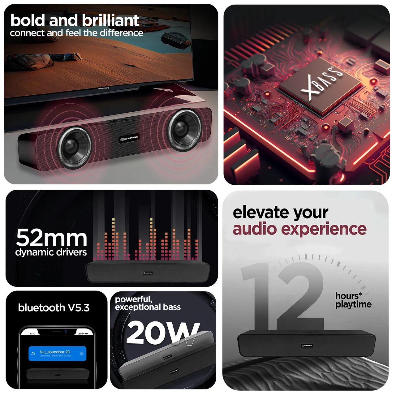 Upgrade your audio experience with the Nu Republic Soundbar 20. Boasting 12 hours of music playtime, this soundbar features massive 52mm dynamic drivers in a sleek, slim design. Powered by Nu Republic’s X-Bass technology, it delivers 20W of rich, powerful bass that will elevate your parties. The classic design enhances any room’s decor, while the advanced technology ensures a high-quality sound experience. Whether you’re hosting a party or enjoying a movie night, the Nu Republic Soundbar 20 is sure to impress with its impressive audio performance