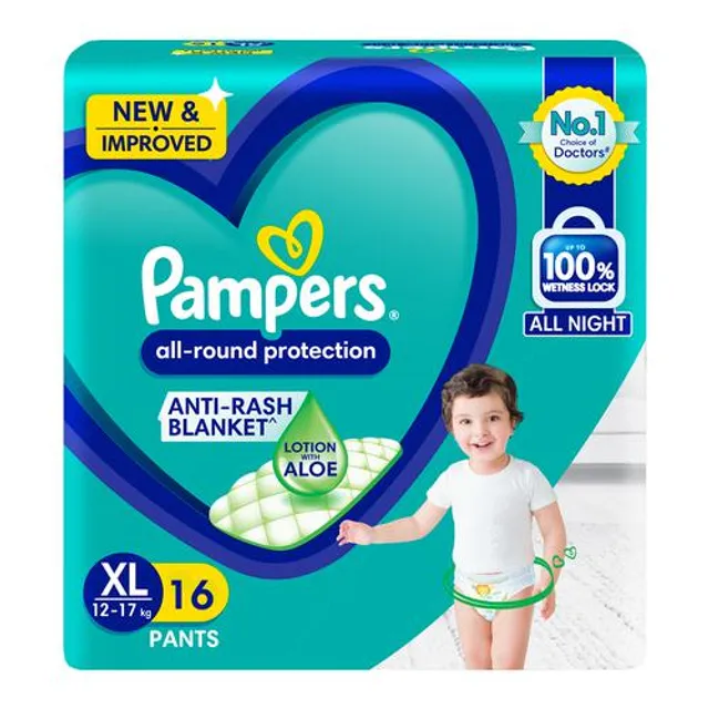 •New & Improved Pampers All-round Protection Pants – high quality diaper pants for complete protection of your baby from World’s #1 diaper brand* (*Based on Euromonitor International, Tissue and Hygiene, 2021ed, Pampers in #1 Nappy/Diapers/Pants sales brand globally in terms of both retail value sales (RSP) and volume, all retail channels, 2020 data or Source: Euromonitor International, global diaper sales, 2020 data). •Anti-Rash Blanket^–India’s first diapers containing Lotion with Aloe Vera that prevents rashes. (^Blanket refers to soft topsheet with lotion. Helps prevent rash due to wetness after1 day of usage, based on clinical studies in USA 2000-2019) •Up to 100% Wetness Lock-Unique MagicGel ™technology that locks all pee & poo inside ensuring quality sleep for your baby ALL NIGHT •Extra Soft- New Pampers has an extraaaa soft material to keep your baby comfortably sleeping ALL NIGHT •Up to 12hrs Absorption-Designed for soaking all-night urine with upto 2X Faster absorption speed keeping baby’s bum dry •Double Leak Cuff Guards–Specially designed inner & outer barriers near thighs to prevent any leakage •No. 1 Choice of Doctors –Pampers knows its science, and is hence #1 Chosen brand by Doctors •Pampers Safety Promise–High quality diapers designed for every newborn’s skin with pH sensitive material, latex-free soft elastics, and zero parabens •Dermatologically Tested & Approved by Skin Health Alliance © •Available in sizes Newborn, Small, Medium, Large, XL, XXL, XXXL diapers •Download the Pampers Baby World App and WIN Exciting prizes