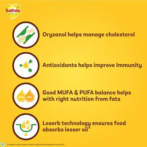 - New Saffola Gold cooking oil comes with LOSORBâ„¢ technology which ensures that your food absorbs upto 33%* lesser oil .