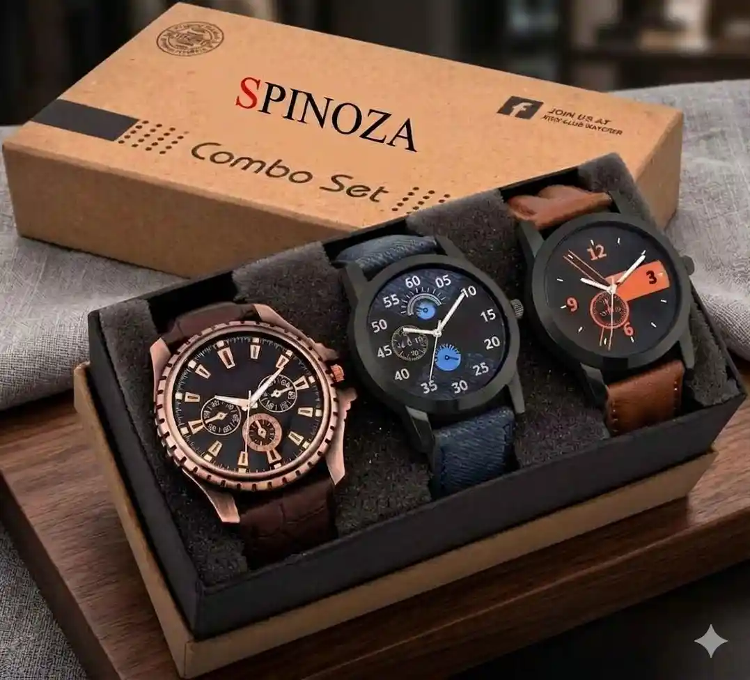 Discover timeless elegance with the Spinoza Analog Watch Combo Set – For Men, available at AliKart Raichur. This premium set includes three stylish wristwatches with chronograph‑pattern dials in brown, blue, and copper tones.