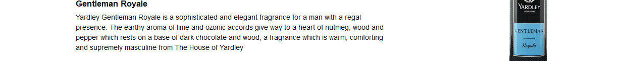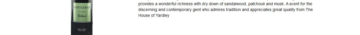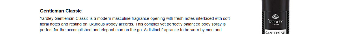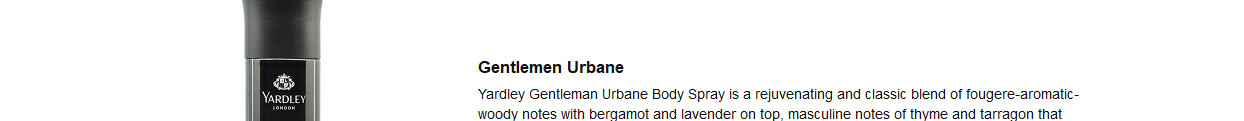 Try the exciting tripack Of our Gentleman series Yardley Gentleman Urbane Yardley Gentleman Royale and Yardley Gentleman Classic are the best companions to fight Odor Causing Bacteria This pack has 3 variants of Fragrances for men; Yardley Gentleman Urbane is a fragrance with vigour and flamboyance; Yardley Gentleman Royale is a sophisticated and elegant fragrance with a regal presence and Yardley Gentleman Classic is a modern masculine fragrance opening with fresh citrus black pepper and a spicy blend of cardamom