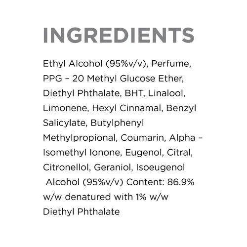 Ethyl Alcohol (95%v/v), Perfume, PPG – 20 Methyl Glucose Ether, Diethyl Phthalate, BHT, Linalool, Limonene, Hexyl Cinnamal, Benzyl Salicylate, Butylphenyl Methylpropional, Coumarin, Alpha – Isomethyl Ionone, Eugenol, Citral, Citronellol, Geraniol, Isoeugenol Alcohol (95%v/v) Content: 86.9% w/w denatured with 1% w/w Diethyl Phthalate